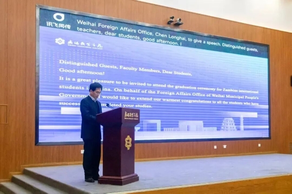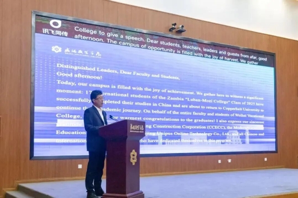 在结业典礼上,赞比亚铜带大学副校长伊玛西库・尼亚姆贝专门发来祝福短片。他在片中衷心感谢威海职业学院为留学生提供的高质量职业教育和细致的人文关怀,高度肯定了中赞携手共建的 “班・墨学院” 所取得的务实合作成效,勉励全体留学生以 “技术使者”“友谊纽带” 双重身份,搭建中赞合作桥梁,同时表达了未来与威海职业学院深化职业教育领域合作的殷切期待。