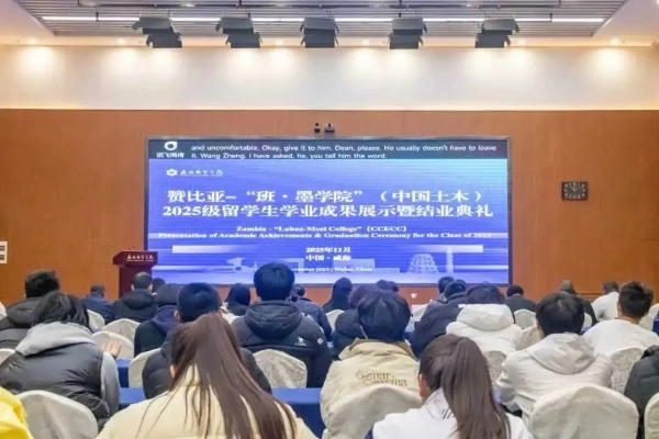 11月28日,赞比亚-“班·墨学院”(中国土木)2025 级留学生学业成果展示暨结业典礼在威海职业学院举行。中国土木工程集团有限公司党委副书记、工会主席孙湘春,现代职业教育研究院院长王建吉,北京外研在线数字科技有限公司总经理李会钦线上出席典礼并致辞;威海市人民政府外事办公室党组书记丛龙海,威海职业学院党委书记李耀华,院长徐东晖,党委委员、宣传部部长刘志刚出席典礼。学院党委副书记李英春,党委委员、副院长王政分别主持。赞比亚的17名留学生,以及市外办与我校相关部门负责人、教师代表参加。