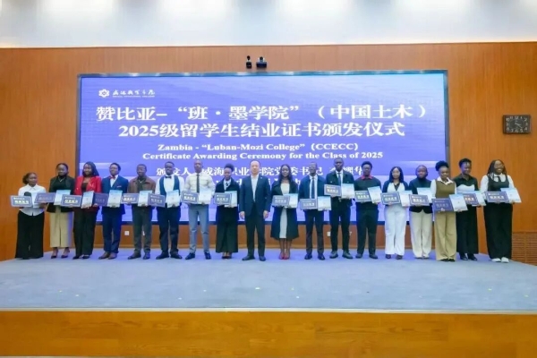 孙湘春在致辞中指出,17名留学生作为赞比亚-“班・墨学院”首批结业生,承载着两国职教合作的希望与未来。他向全体留学生寄予殷切期望,勉励大家勇做中赞友谊的传承者、做专业技能的实践者、做合作共赢的推动者。中国土木将始终秉持“共商、共建、共享”原则,推动赞比亚-“班·墨学院”发展,为构建更加紧密的中非命运共同体贡献“中土力量”。